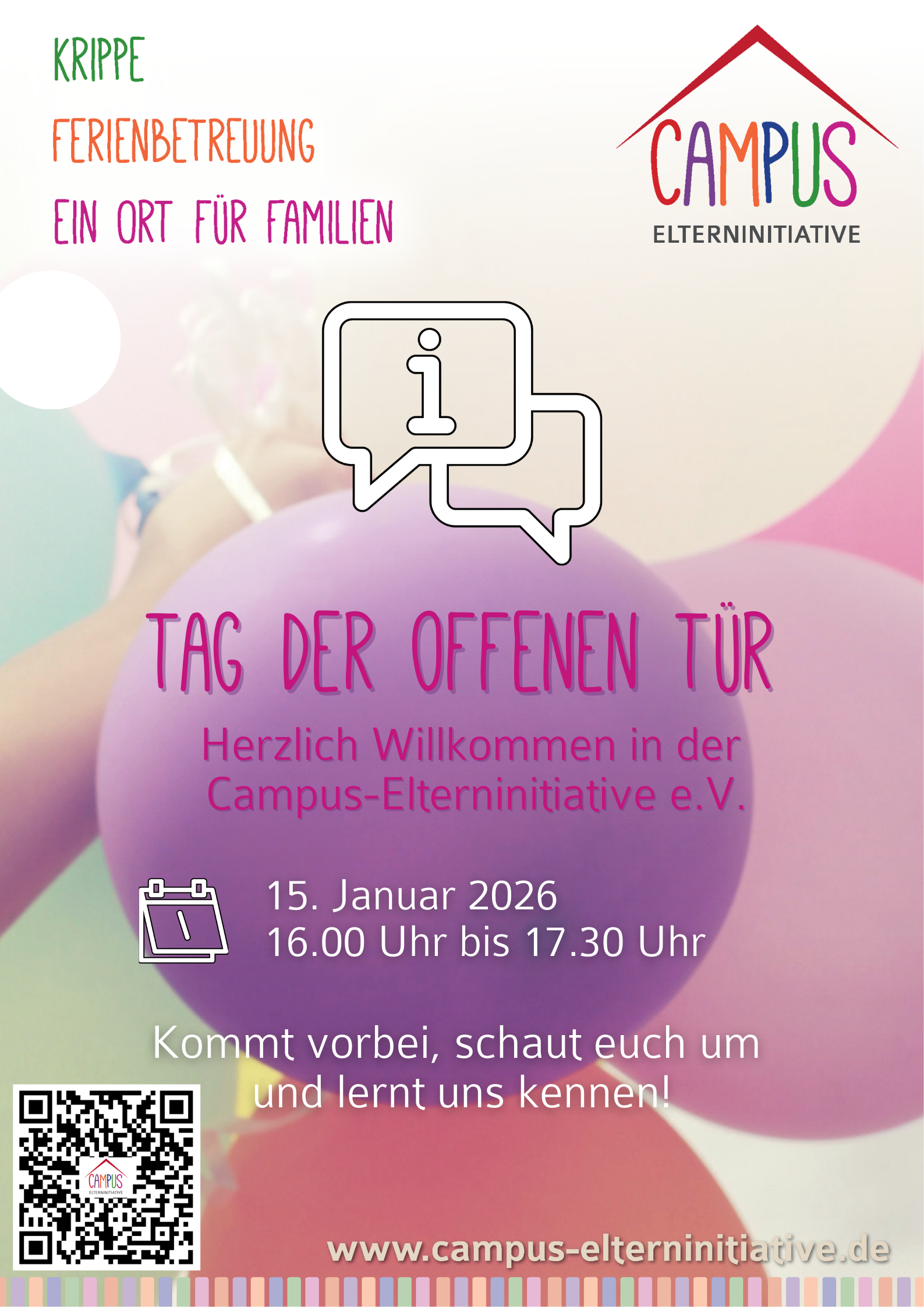 2026 veranstalten wir einen Tag der offenen Tür in unserer Kita. Am 15.01.26 haben interessierte Familien von 16.00 Uhr bis 17.30 Uhr die Möglichkeit, unsere Kita zu besichtigen und mehr über unsere Einrichtung zu erfahren. Wir heißen die Familien herzlich willkommen.